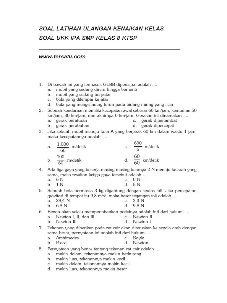 Soal ukk/pat senibudaya kelas 8 semester 2 kurikulum 2013 lengkap kunci jawaban | soal ukk/pat ipa kelas8 semester 2 kurikulum 2013 lengkap . Jadi berikut ini merupakan sajian soal latihan pat/ukk ipa kelas 8 kurikulum 2013 / k13. Pada soal tersebut dapat dijadikan bahan referensi bapak dan ibu . Berikut ini kami bagikan kumpulan link download soal ukk/pat smp/mts untuk kelas 8 (viii) semester 2 (genap) kurikulum 2013 lengkap dengan pemahasannya. Latihan soal tengah semester i ipa kelas 8 kurikulum 2013. Top pdf 3 soal ukk/ uas ipa kelas 8 smp / mts semester 2 ukk ipa 8 smp dikompilasi oleh 123dok.com. Tekanan zat dan penerapannya dalam kehidupan . Menurut buku pedoman atau panduan penilaian smp, penilaian akhir tahun (pat) adalah penilaian yang dilaksanakan pada akhir semester genap dengan materi semua kd . Selain hasil ukk, kenaikan kelas juga ditentukan oleh nilai harian, nilai ulangan tengah semester, nilai tugas, serta nilai sikap dan sikap termasuk kehadiran . Berikut kunci jawaban contoh soal untuk latihan menghadapi ulangan akhir semester (uas) kelas 8 smp semeter genap 2021. Latihan soal ini merupakan latihan soal dari materi ipa kelas 8 smp/ mts semester 2 yang mencakup : Latihan ukk ipa smp kelas 7 semester 2. Cakupan penilaian meliputi seluruh indikator yang merepresentasikan kd pada semester genap saja, atau sanggup merepresentasikan kd dalam kurun waktu satu tahun .
